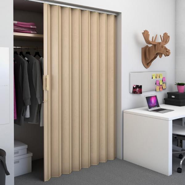Non acoustic accordion doors canada only woodfold offers accordion doors in vinyl and hardwood finishes for both commercial and residential applications including closets room dividers or even bathroom doors.